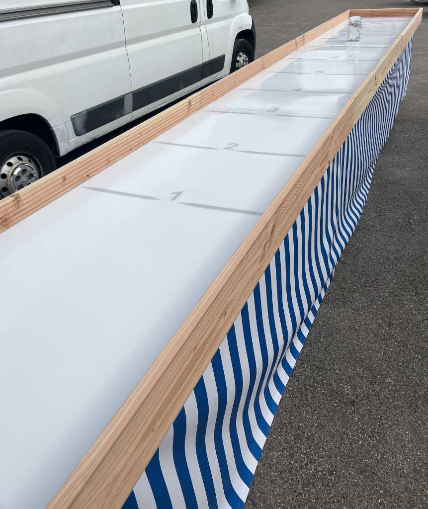Unsere 6 Meter lange Maßkrugschieben-Bahn ist ein echter Publikumsmagnet für jedes Event. Aufgebaut in drei handlichen Segmenten lässt sich die Bahn schnell und unkompliziert transportieren und aufstellen. Die Oberfläche besteht aus einer hochwertigen Super-Slide-Platte, die für ein perfektes Rutschen und Gleiten der Maßkrüge sorgt. Durch die eingebaute Skala von 1 bis 10 lässt sich jeder Wurf klar bewerten und sorgt für spannende Wettkämpfe unter den Teilnehmern.