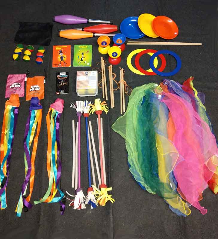 Die Kiste gefüllt mit: allem was man zum jonglieren brauchen kann, wie: Keulen, Jonglierteller, Jonglierbälle, Tücher, Pois, Devil Sticks, Anleitungen, Hacki Sacks, uvm.